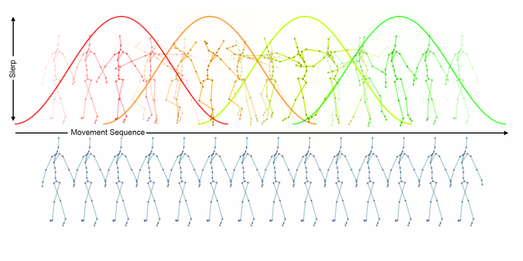The sequence blending mechanism is inspired by two methods from computer music that combine short sound fragments to generate longer sounds: Granular Synthesis and Concatenative Synthesis. For this project, the sequence blending mechanism is used to combine short pose sequences generated by the decoder into longer pose sequences. Similar to Granular Synthesis, a window function is superimposed on the pose sequence which in this case blends the joint orientations of the overlapping pose sequences by spherical linear interpolation.