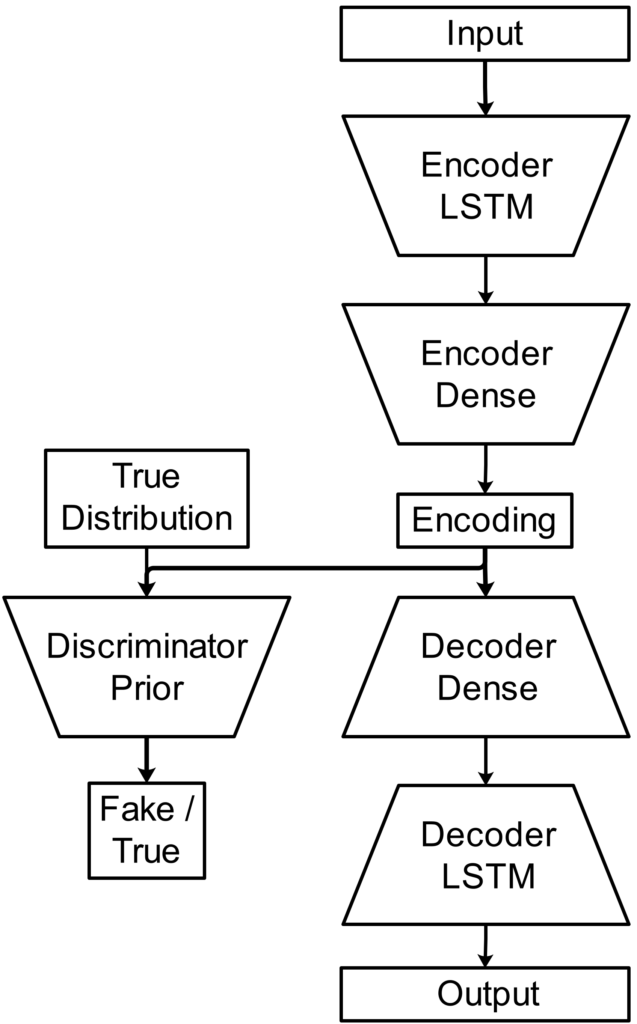 The model consists of an encoder, decoder, and discriminator. The autoencoder part operates on sequence of poses in which each pose is represented by joint orientations in the form of unit quaternions. The discriminator takes as input a latent encoding of a pose sequence and generates as output an estimate whether the encoding follows a Gaussian prior distribution.