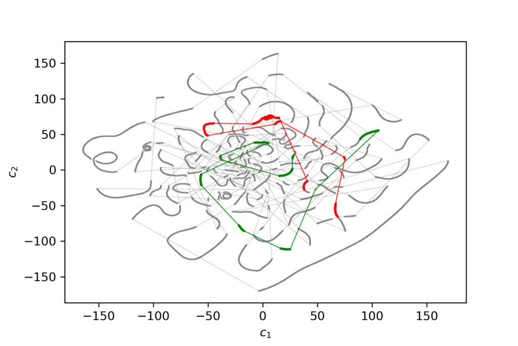 A popular approach of using autoencoders for the purpose of movement generation is to navigate through latent space and collect latent vectors along the way which are then decoded and concatenated into a sequence. Several latent space navigation experiments have been conducted: random walk, trajectory offset following, trajectory interpolation. For these experiments, two types of machine learning models have been employed. A model named model128 works with sequences of 128 poses and an encoding dimension of 64. Another model named model8 works with sequences of 8 poses and an encoding dimension of 16.